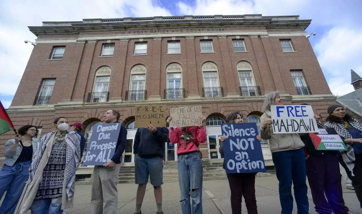 People gather outside the Post Office in Brattleboro, Vt., on Wednesday, April 30, 2025, to show support for Mohsen Mahdawi, who was scheduled to appear in U.S. District Court 11 in Burlington on Wednesday morning. (Kristopher Radder/The Brattleboro Reformer via AP) /The Brattleboro Reformer via AP)