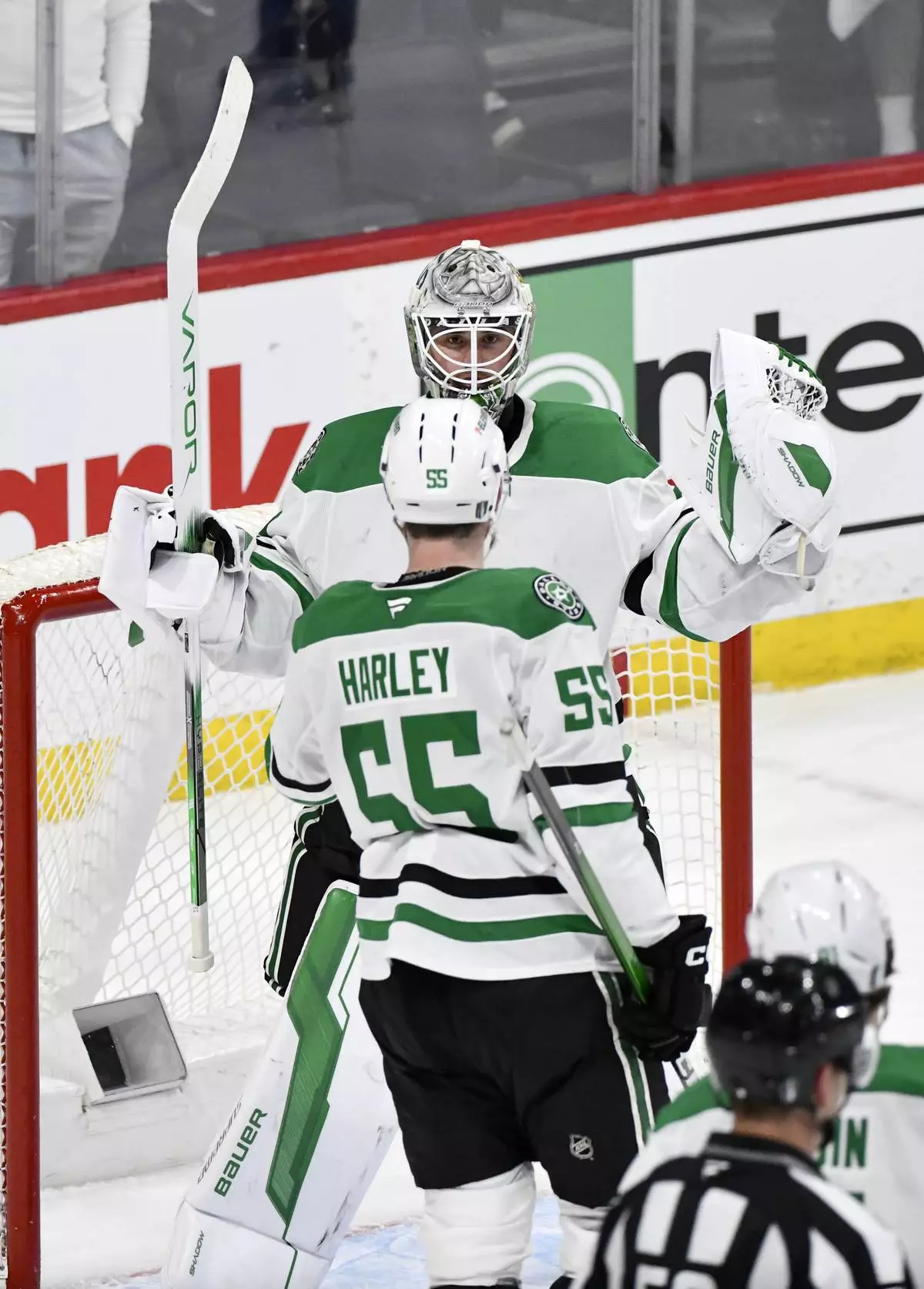 Dallas Stars goaltender Jake Oettinger (29) celebrates the win over the Winnipeg Jets with Thomas Harley (55) in NHL playoff hockey action in Winnipeg, Canada, Wednesday, May 7, 2025. (Fred Greenslade/The Canadian Press via AP)