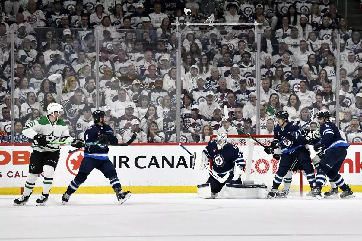 Winnipeg Jets players crowd the net around Dallas Stars goaltender Jake Oettinger trying to score in the last minutes of the third period NHL playoff hockey action in Winnipeg, Canada, Wednesday, May 7, 2025. (Fred Greenslade/The Canadian Press via AP)
