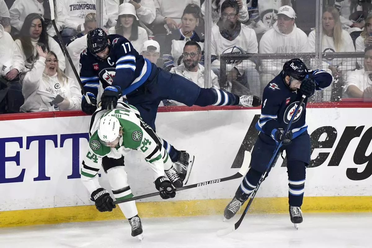 Winnipeg Jets' Adam Lowry (17) and Neal Pionk (4) collide with Dallas Stars' Roope Hintz (24) during first period NHL playoff hockey action in Winnipeg, Wednesday, May 7, 2025. (Fred Greenslade/The Canadian Press via AP)
