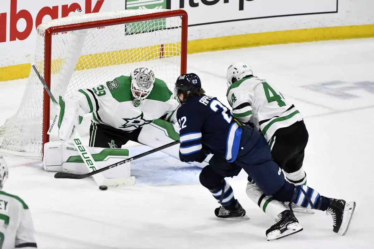 WINNIPEG, Manitoba (AP) — Mikko Rantanen had a natural hat trick in the second period, Jake Oettinger stopped 30 shots and the Dallas Stars beat the Winnipeg Jets 3-2 on Wednesday night in Game 1 of the second-round series.