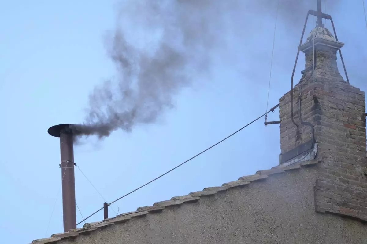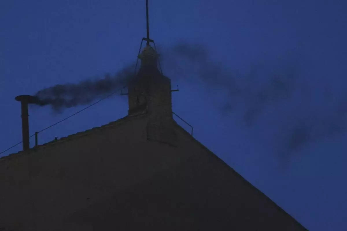 Black smoke billows from the chimney of the Sistine Chapel during the conclave to elect a successor of late Pope Francis, at the Vatican, Thursday, May 8, 2025. (AP Photo/Antonio Calanni)