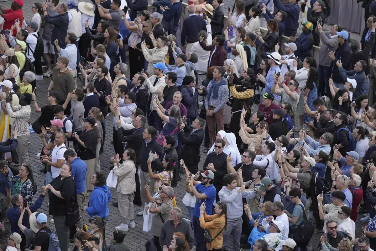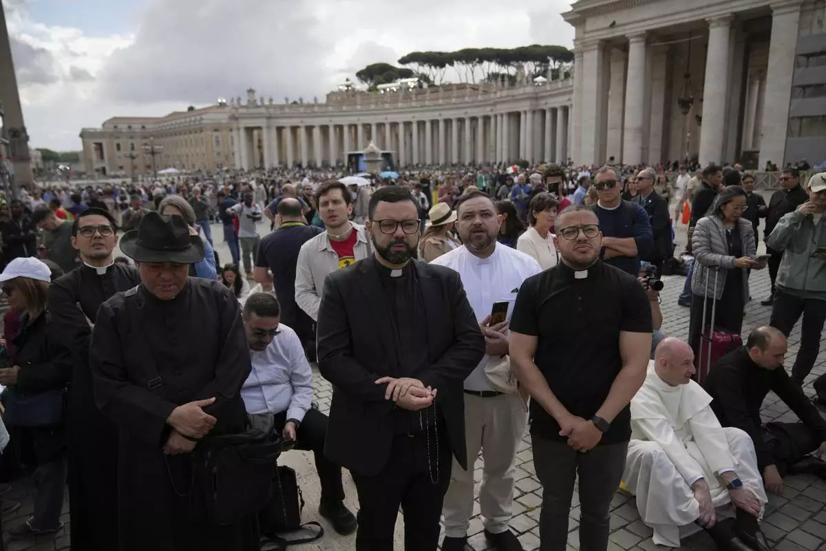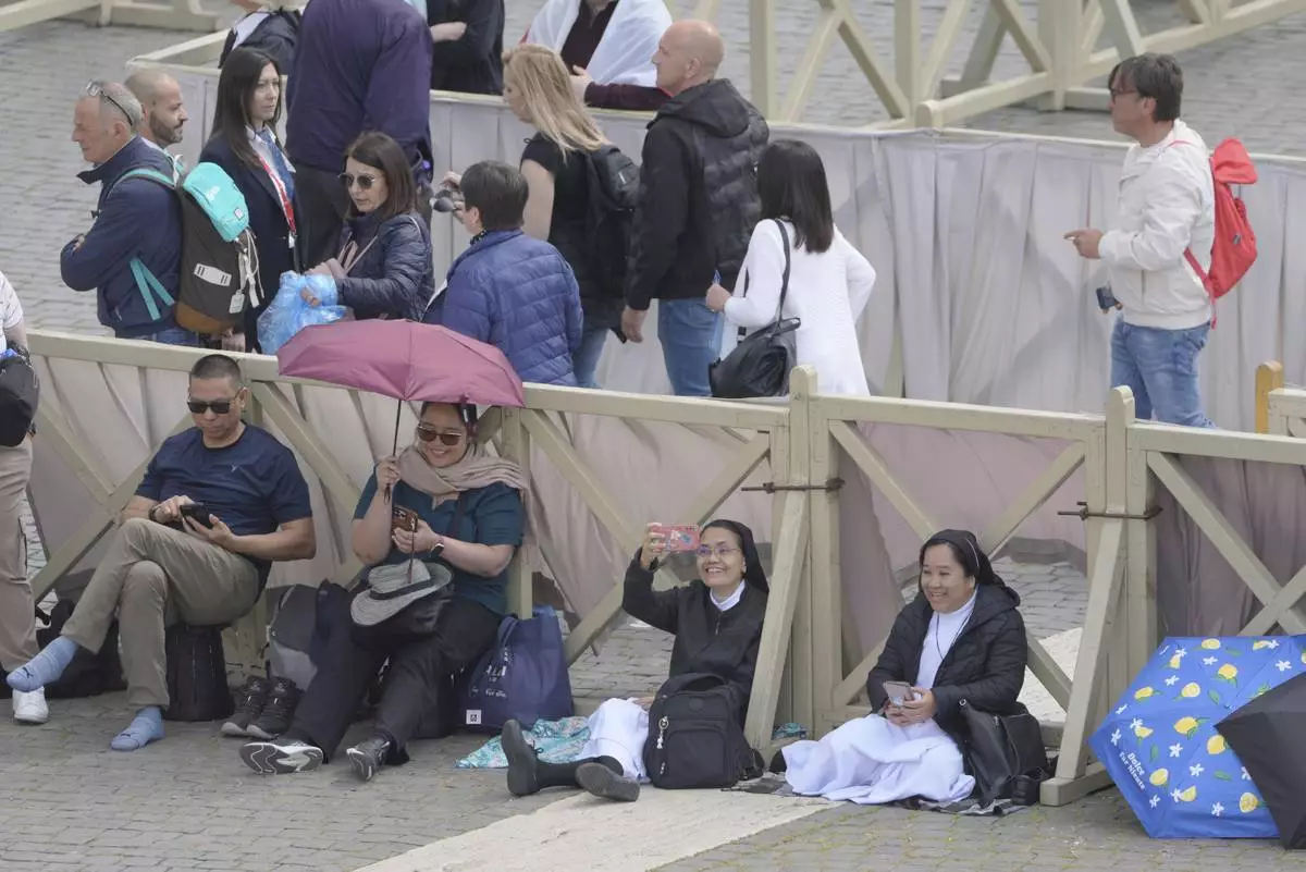 People arrive at St. Peter's Square at the Vatican where 133 cardinals gather on the second day of the conclave to elect successor of late Pope Francis, Thursday, May 8, 2025. (AP Photo/Markus Schreiber)