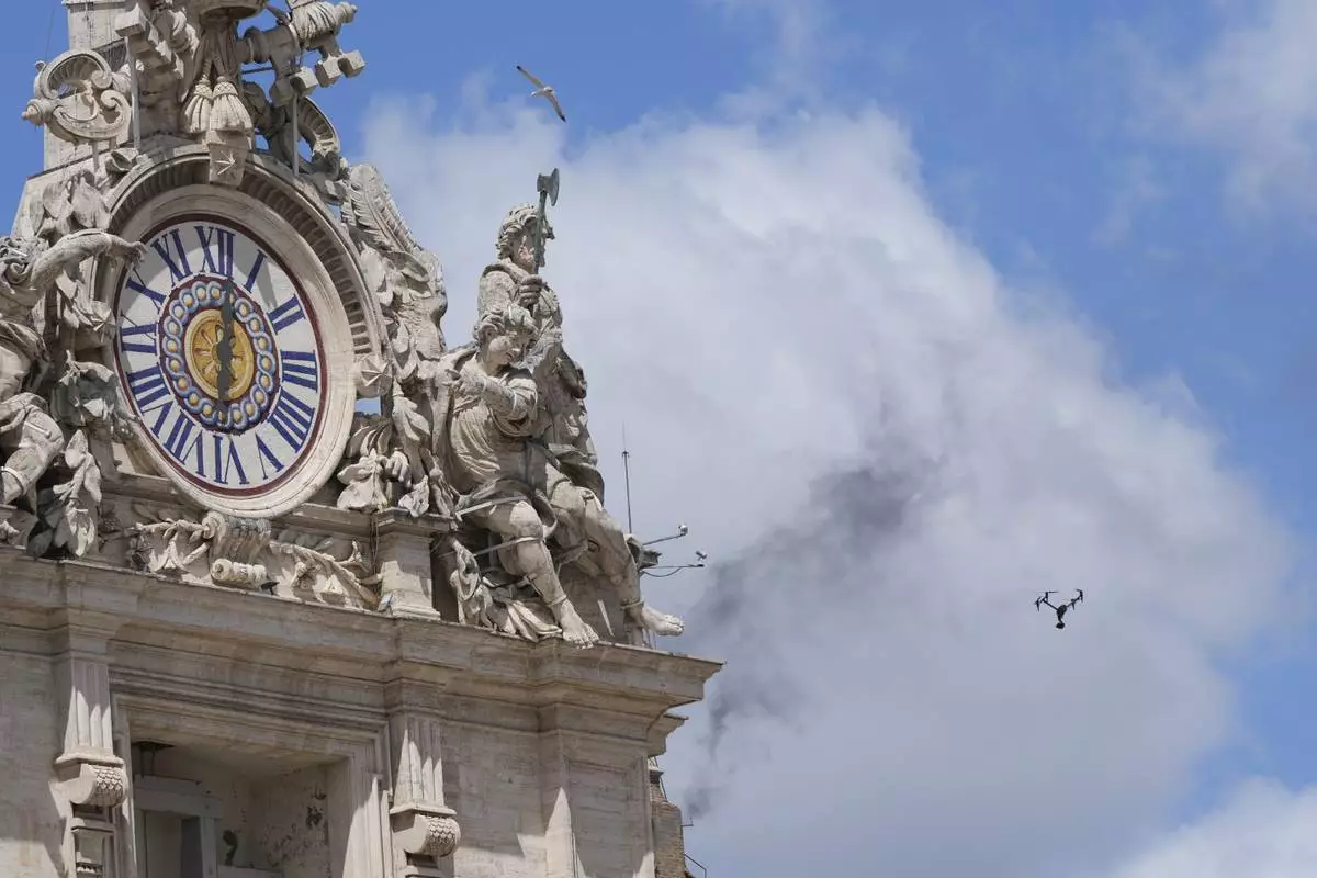 A drone flies as black smoke billows from the chimney of the Sistine Chapel where 133 cardinals are gathering on the second day of the conclave to elect a successor to late Pope Francis, at the Vatican, Thursday, May 8, 2025. (AP Photo/Luca Bruno)