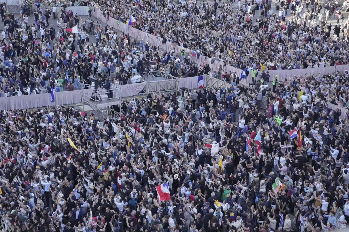 Crowds cheer in St. Peter's square after the election of the 267th pontiff of the Roman Catholic Church, at the Vatican, Thursday, May 8, 2025. (AP Photo/Gregorio Borgia)