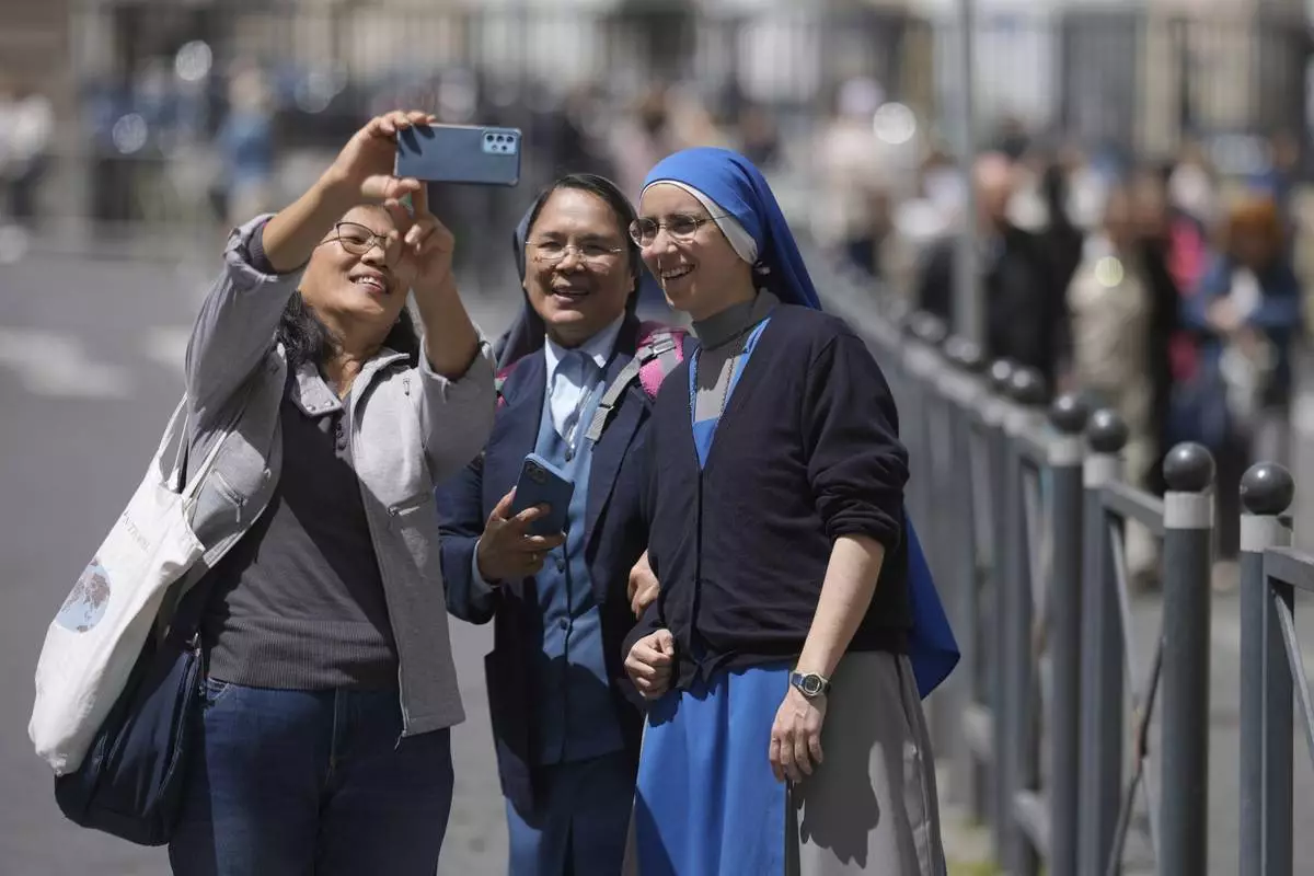 A woman takes selfie with nuns at St. Peter's Square where 133 cardinals are gathering on the second day of the conclave to elect successor of late Pope Francis, at the Vatican, Thursday, May 8, 2025. (AP Photo/Markus Schreiber)