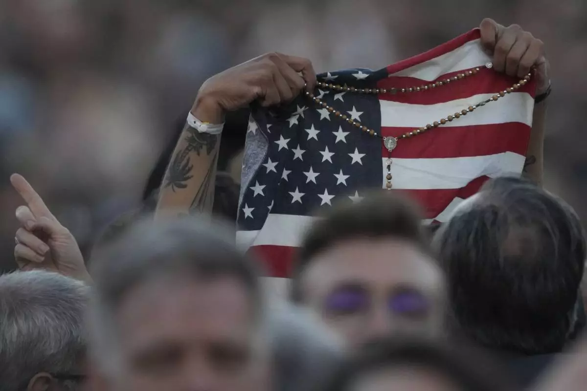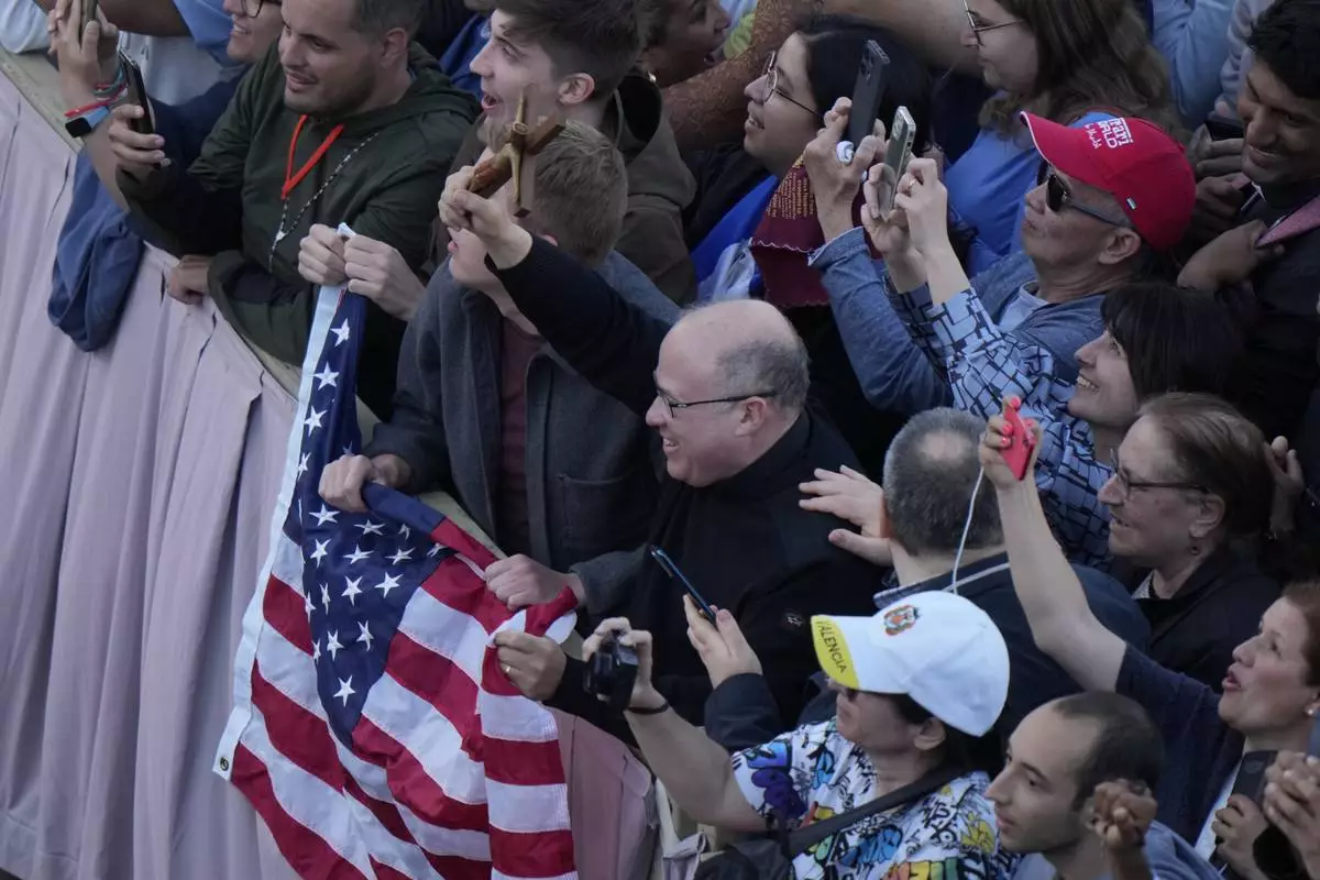 Faithful holds an American flag following the election of Pope Leo XIV at the Vatican, Thursday, May 8, 2025. (AP Photo/Andrew Medichini)