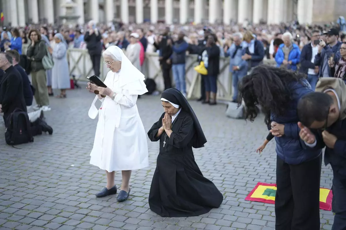 Sor Clara a nun from Peru prays during the speech of the newly elected Pope Leo XIV at the Vatican, Thursday, May 8, 2025. (AP Photo/Francisco Seco)