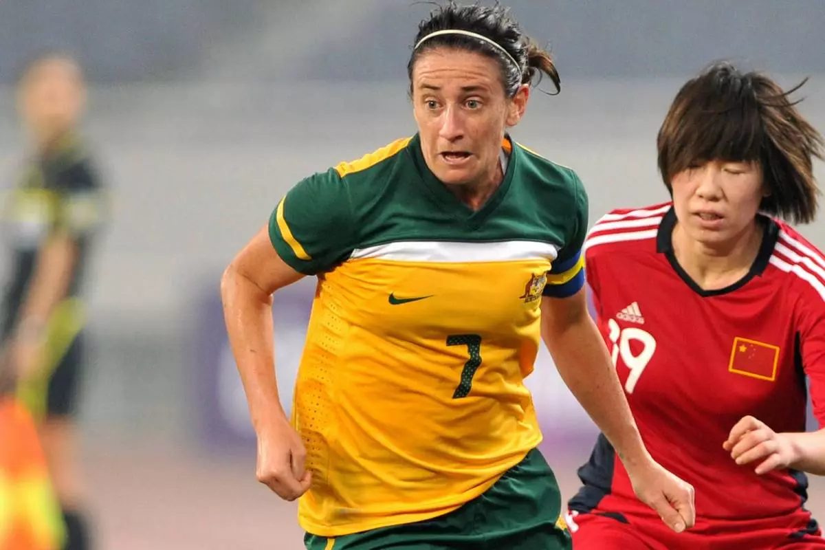FILE - In this photo released by China's Xinhua news agency, Australia's Heather Garriock (7) vies with China's Zhou Feifei during their qualifying match of the 2012 Olympic women's soccer tournament in Jinan, China, Thursday, Sept. 8, 2011. (AP Photo/Xinhua, Xu Suhui, File)