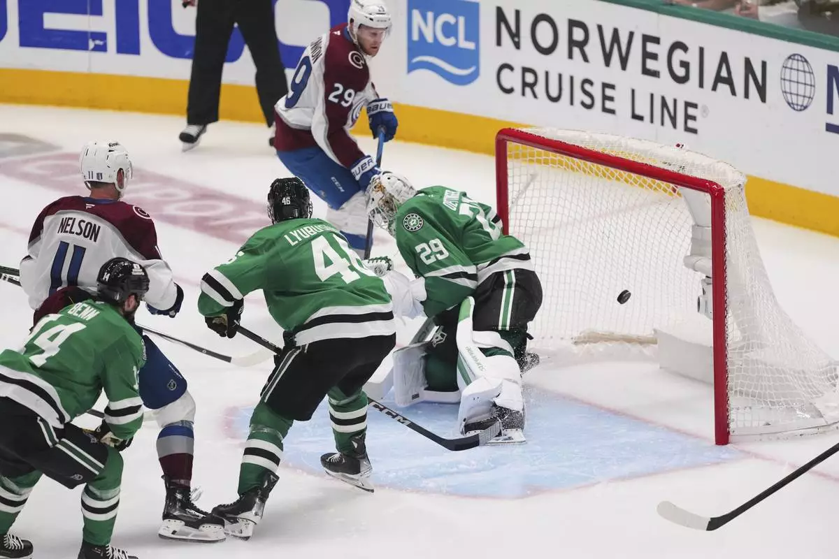 Colorado Avalanche's Nathan MacKinnon (29) sores against Dallas Stars' Jake Oettinger (29) as Brock Nelson (11), Dallas Stars' Jamie Benn (14) and Ilya Lyubushkin (46) look on in the third period in Game 7 of a first-round NHL hockey playoff series Saturday, May 3, 2025, in Dallas. (AP Photo/Julio Cortez)