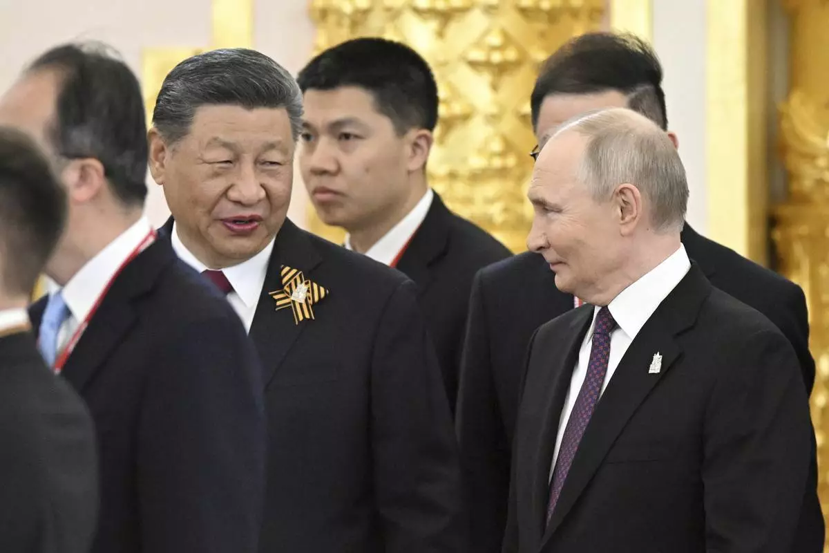 Russian President Vladimir Putin, right, and his Chinese counterpart Xi Jinping arrive for their talks at the Kremlin in Moscow, Russia, Thursday, May 8, 2025, ahead of celebrations of the 80th anniversary of the Soviet Union's victory over Nazi Germany during the World War II. (Alexei Danichev/Photo host agency RIA Novosti via AP)