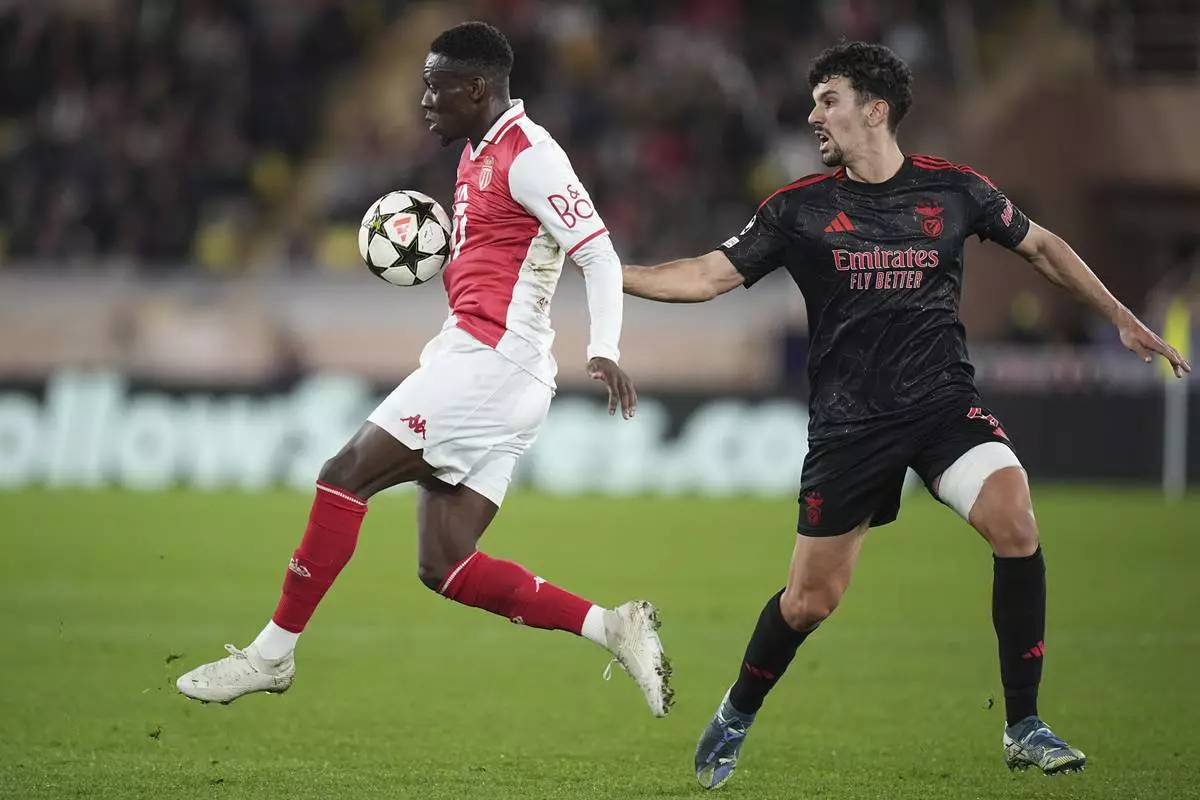 FILE - Monaco's Folarin Balogun, left, controls a ball chased by Benfica's Tomas Araujo during a Champions League opening phase soccer match at the Louis II stadium in Monaco, Wednesday, Nov. 27, 2024. (AP Photo/Laurent Cipriani, File)