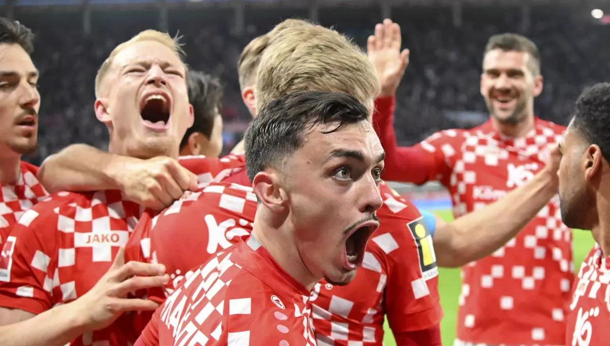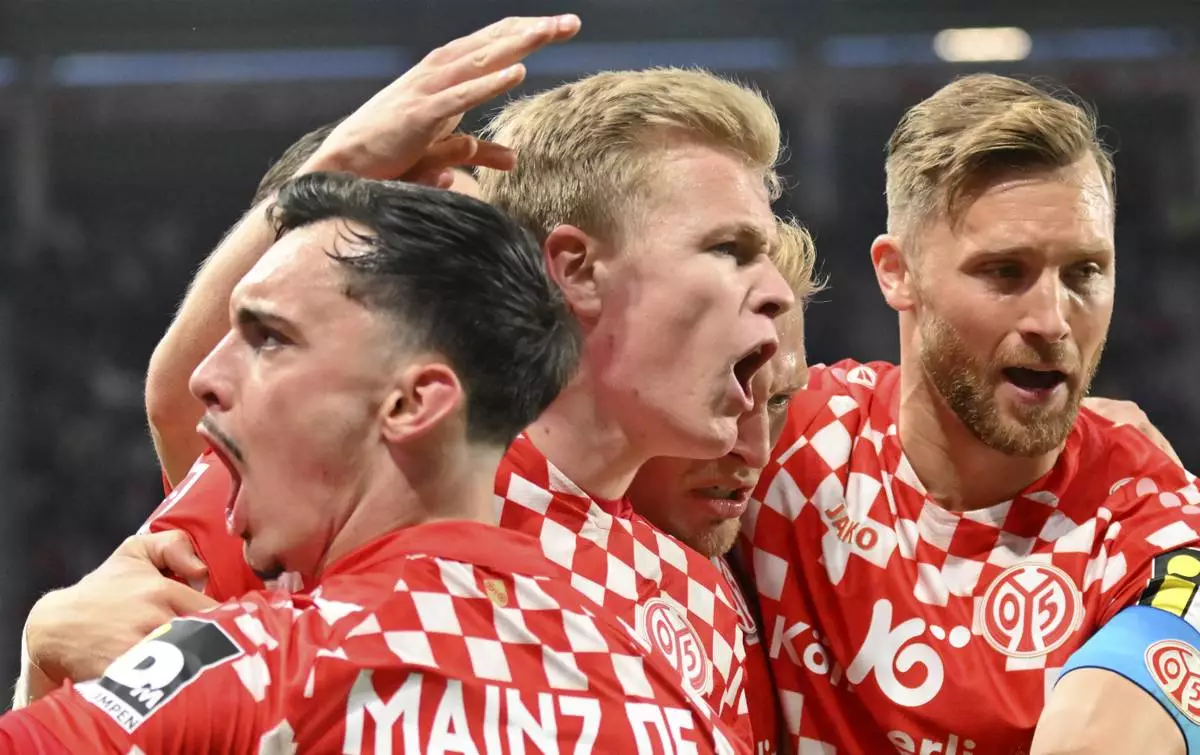 Mainz's Paul Nebel, foreground, celebrates the goal by Jonathan Burkhardt, during the German Bundesliga soccer match between FSV Mainz 05 and Eintracht Frankfurt, at Mewa Arena, in Mainz, Germany, Sunday, May 4, 2025. (Torsten Silz/dpa via AP)