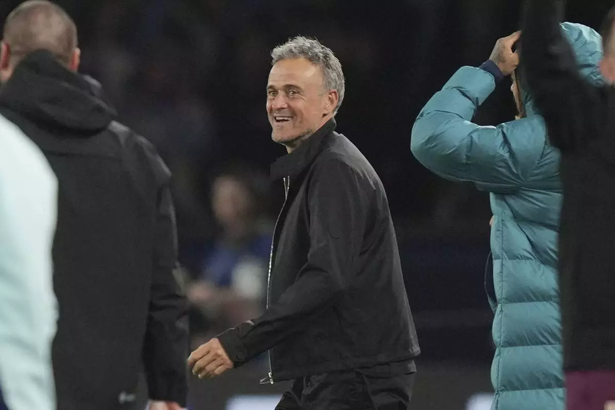 PSG's head coach Luis Enrique celebrates after the Champions League semifinal, second leg soccer match between Paris Saint-Germain and Arsenal at the Parc des Princes in Paris, Wednesday, May 7, 2025. (AP Photo/Thibault Camus)