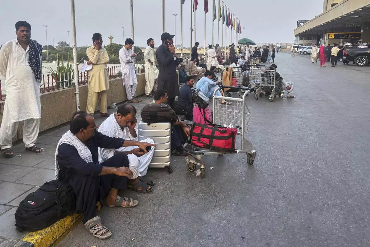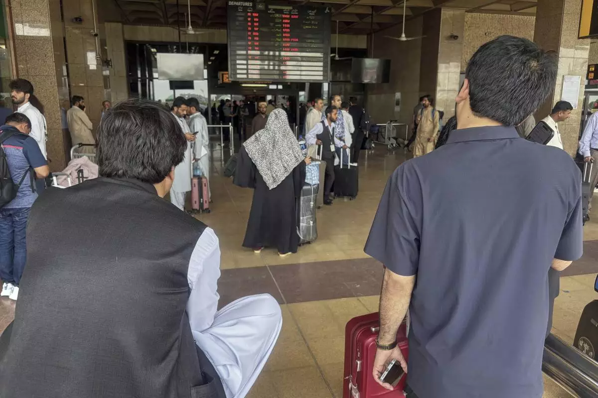 Stranded passengers wait at a arrival area of Jinnah airport, which shutdown following Indian airstrikes in Pakistani areas, in Karachi, Pakistan, Wednesday, May 7, 2025. (AP Photo/Mohammad Farooq)
