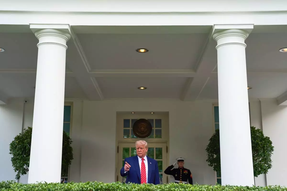 President Donald Trump speaks with reporters in front of the West Wing of the White House, Thursday, May 8, 2025, in Washington. (AP Photo/Alex Brandon)