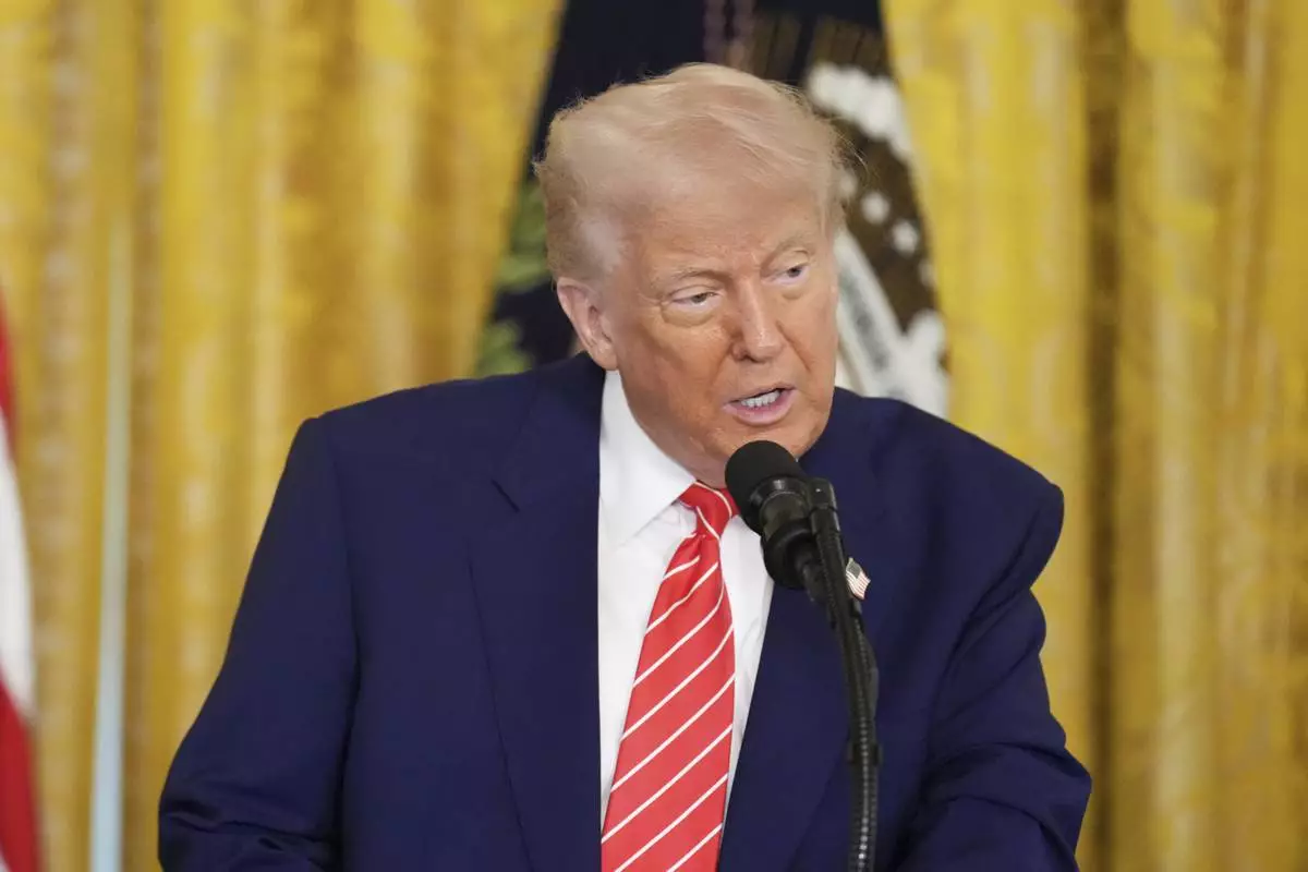 President Donald Trump speaks at an event for Military Mothers, Thursday, May 8, 2025, in the East Room of the White House in Washington. (AP Photo/Jacquelyn Martin)