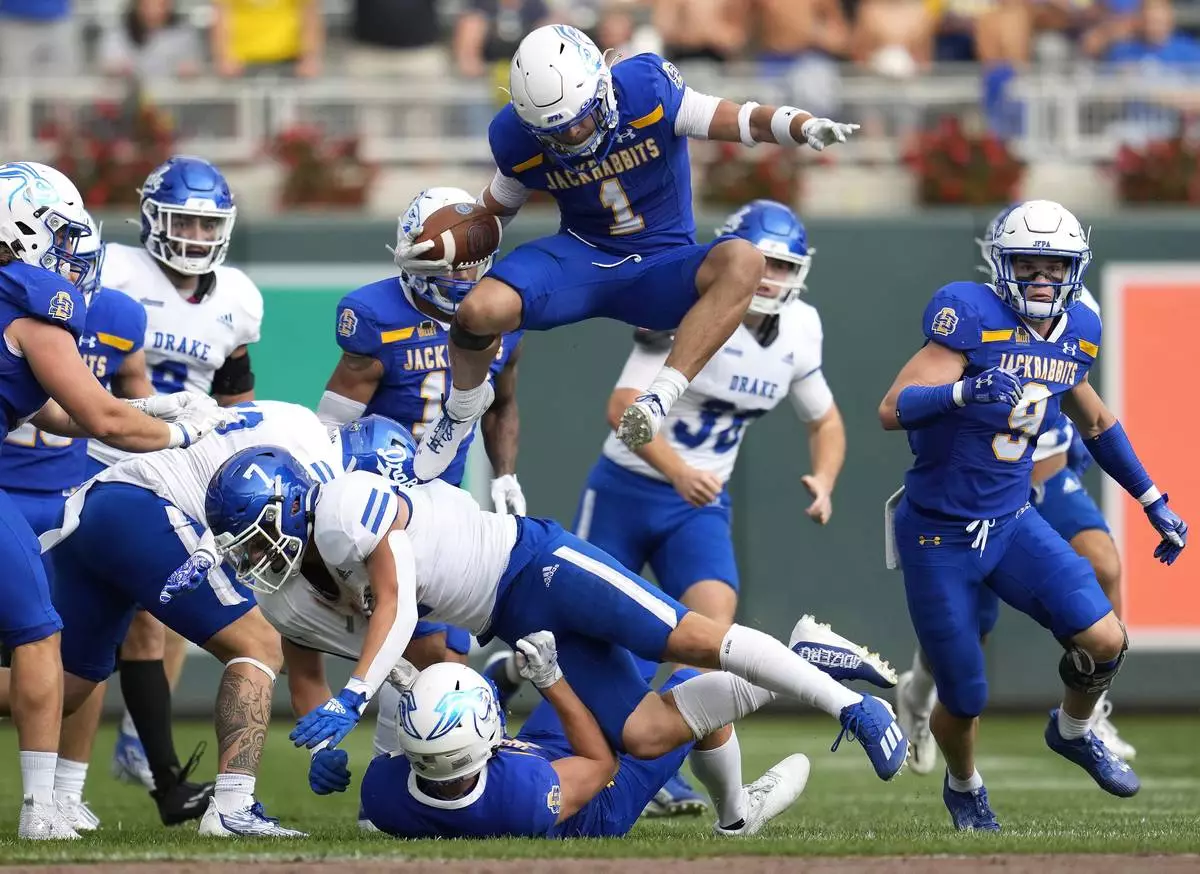 FILE - South Dakota State wide receiver Jadon Janke (1) hurdles Drake linebacker J.R. Flood (7) during the first half of an NCAA college football game Sept. 16, 2023, in Minneapolis. (AP Photo/Abbie Parr, File)