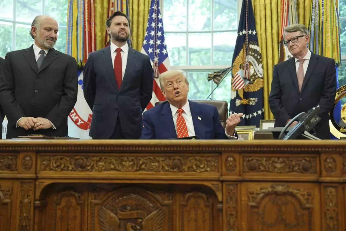 President Donald Trump, center, with from l-r., Commerce Secretary Howard Lutnick, Vice President JD Vance, and Britian's ambassador to the United States Peter Mandelson, making remarks on a trade deal between U.S. and U.K. in the Oval Office of the White House, Thursday, May 8, 2025, in Washington. (AP Photo/Evan Vucci)