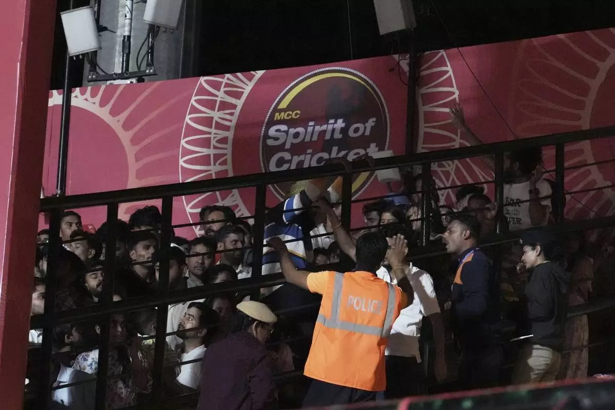 A policeman gestures to the spectators after the authorities asked to evacuate the stadium during the Indian Premier League cricket match between Punjab Kings and Delhi Capitals at Himachal Pradesh Cricket Association Stadium in Dharamshala, India, Thursday, May 8, 2025. (AP Photo/Ashwini Bhatia)