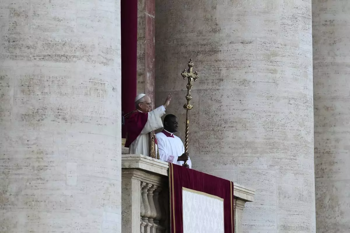Pope Leo XIV appears on the central loggia of St. Peter's Basilica after being chosen the 267th pontiff of the Roman Catholic Church, at the Vatican, Thursday, May 8, 2025. (AP Photo/Alessandra Tarantino)