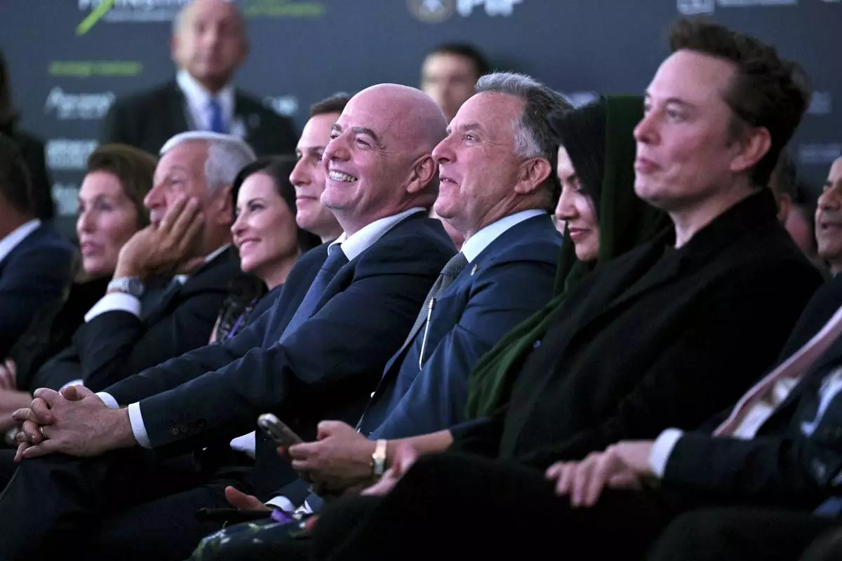 FILE - From right, Elon Musk, U.S. special envoy to the Middle East Steve Witkoff, FIFA President Gianni Infantino and Jared Kushner listen as President Donald Trump speaks at the Future Investment Initiative (FII) Institute summit in Miami Beach, Fla., Feb. 19, 2025. (Pool via AP)