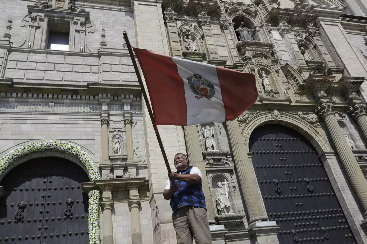 A man waves a Peruvian flag in front of the Cathedral after Cardinal Robert Prevost was elected as the new pope taking the name Leo XIV, in Lima, Peru, Thursday, May 8, 2025. (AP Photo/Cesar Zamalloa)