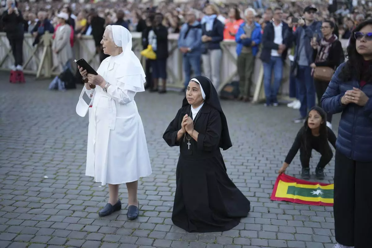 Sor Clara a nun from Peru prays during the speech of the newly elected Pope Leo XIV at the Vatican, Thursday, May 8, 2025. (AP Photo/Francisco Seco)