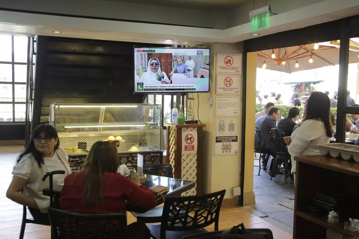Diners lunch in a restaurant where a television programs airs an interview with a nun who used to work alongside Robert Prevost, who was elected as the new pope, taking the name Leo XIV, in Lima, Peru, Thursday, May 8, 2025. (AP Photo/Cesar Zamalloa)