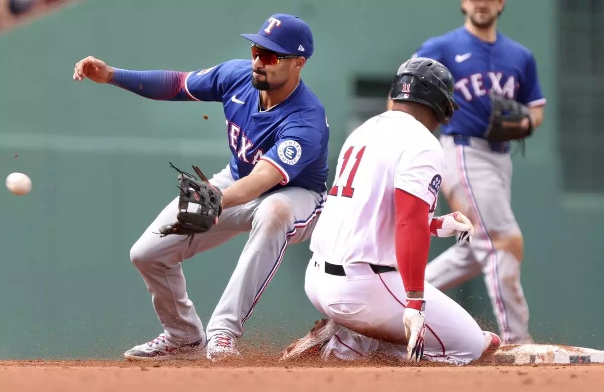 Boston Red Sox's Rafael Devers (11) beats the throw to Texas Rangers second baseman Marcus Semien as he steals second base in the fifth inning of a baseball game, Thursday, May 8, 2025, in Boston. (AP Photo/Jim Davis)