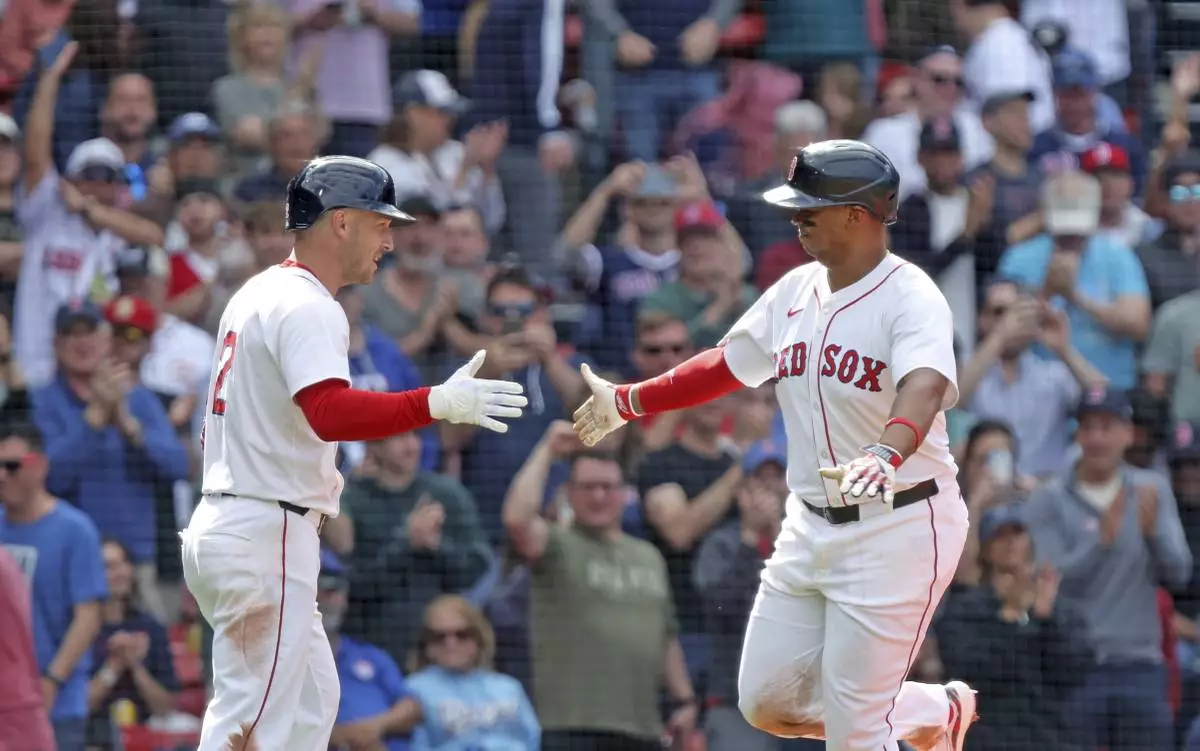 Boston Red Sox's Alex Bregman, left, congratulates teammate Rafael Devers, right, after his home run in the seventh inning of a baseball game against the Texas Rangers on Thursday May 8, 2025, in Boston. (AP Photo/Jim Davis)