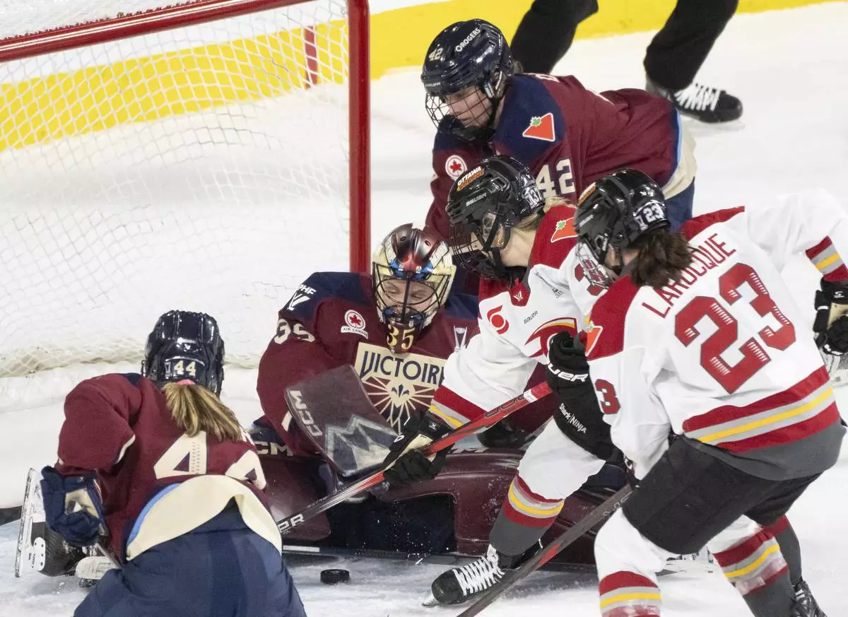 Ottawa Charge's Rebecca Leslie (second right) and Jocelyne Larocque (23) battle for the rebound in front of Montreal Victoire goaltender Ann-Renee Desbiens (35) during second period PWHL playoff hockey action in Laval, Que., on Thursday, May 8, 2025. (Christinne Muschi/The Canadian Press via AP)