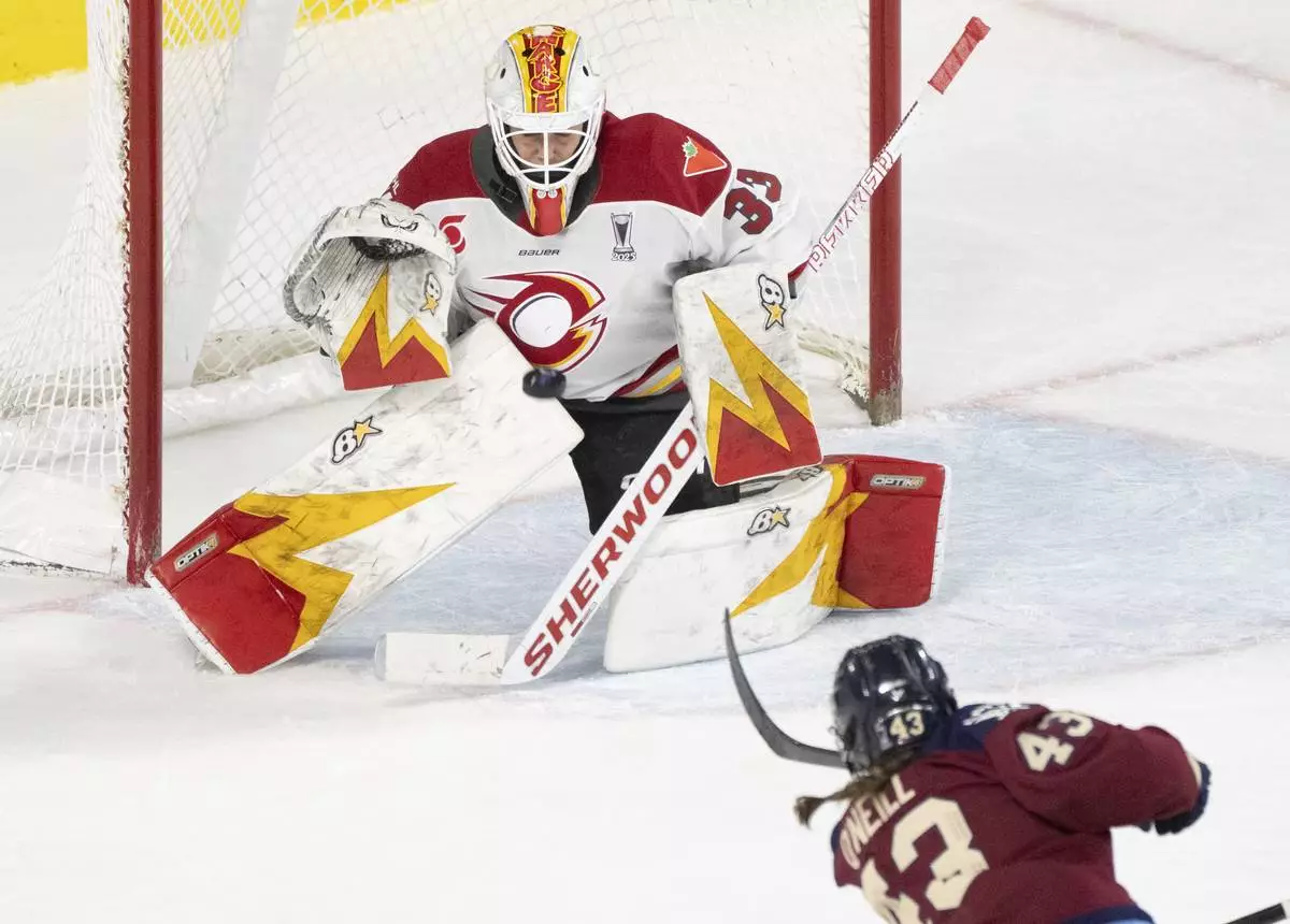 Ottawa Charge goaltender Gwyneth Philips (33) stops a shot by Montreal Victoire's Kristin O'Neill (43) during the third period of a PWHL hockey playoff game in Laval, Quebec, Thursday, May 8, 2025. (Christinne Muschi/The Canadian Press via AP)