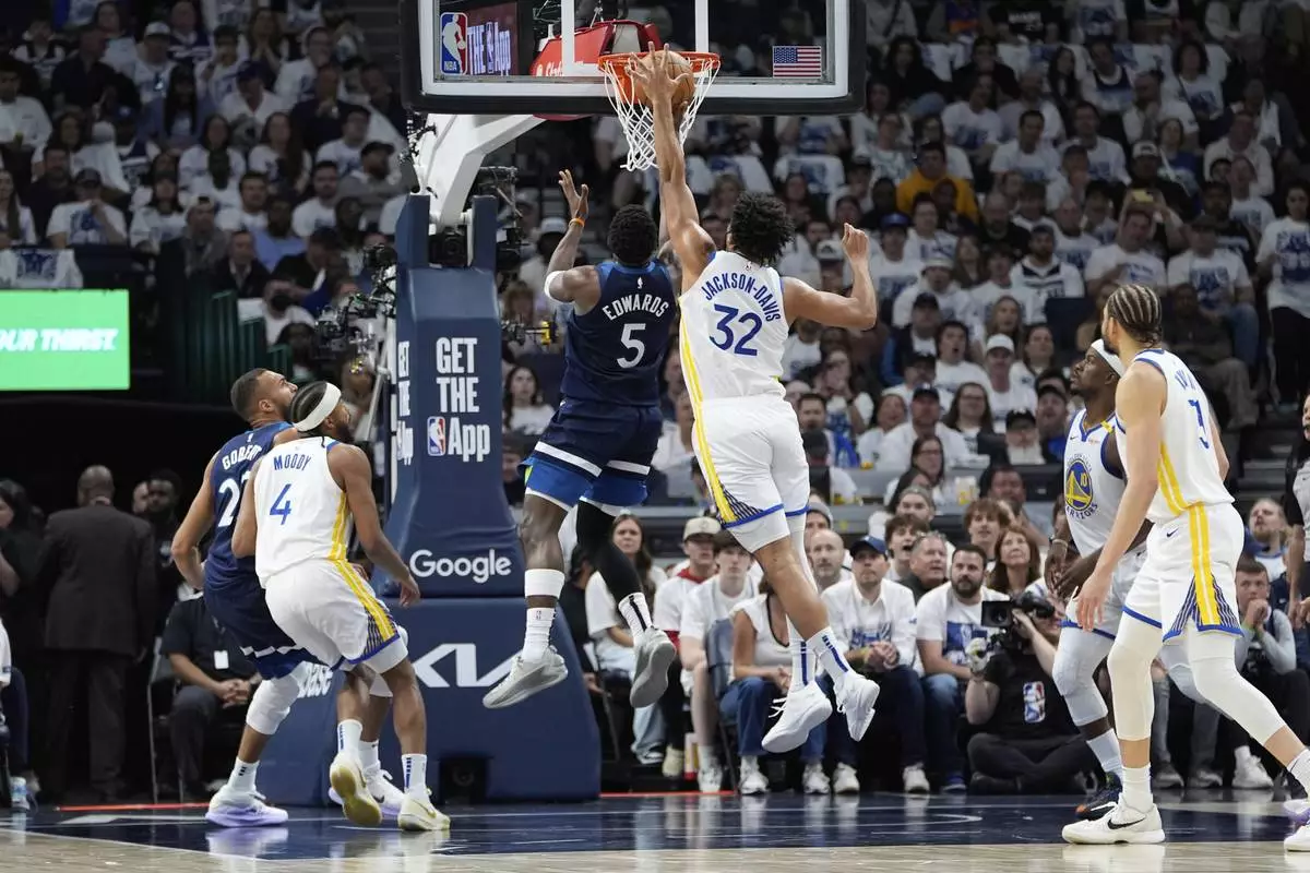 Edwards tried to finish a fast break with a layup that Warriors center Trayce Jackson-Davis blocked before landing on Edwards' left foot as they both came down.
