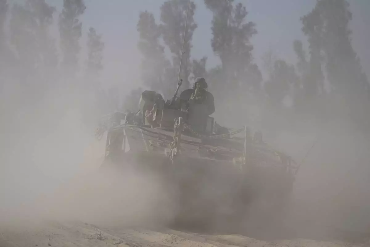 Israeli troops move along the border with Gaza, in southern Israel, Thursday, May 8, 2025. (AP Photo/Ariel Schalit)