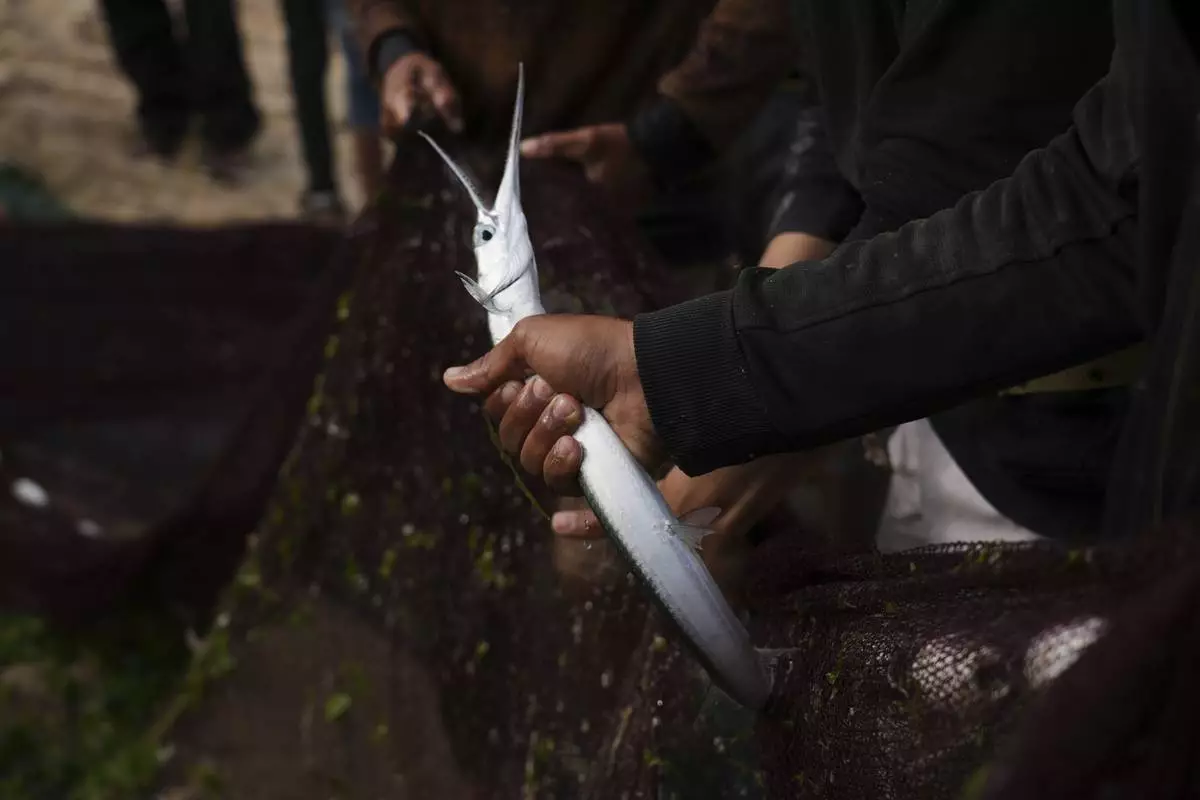 Palestinian fishermen collect their catch in nets along the Mediterranean shore in Nuseirat, Gaza Strip, on Thursday, May 8, 2025 (AP Photo/Abdel Kareem Hana)