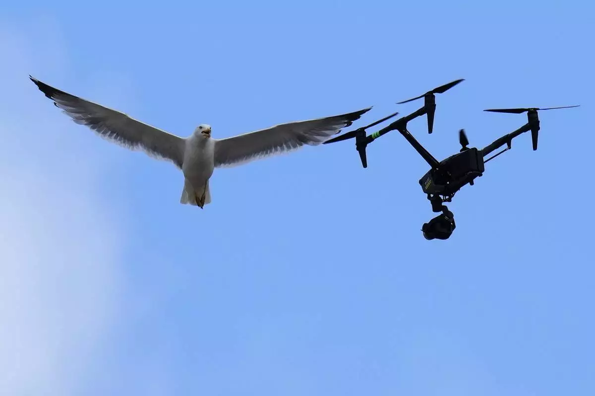 A drone used for TV broadcast is attacked by a seagull above St. Peter's Square where 133 cardinals are gathering on the second day of the conclave to elect successor of late Pope Francis, at the Vatican, Thursday, May 8, 2025. (AP Photo/Gregorio Borgia)