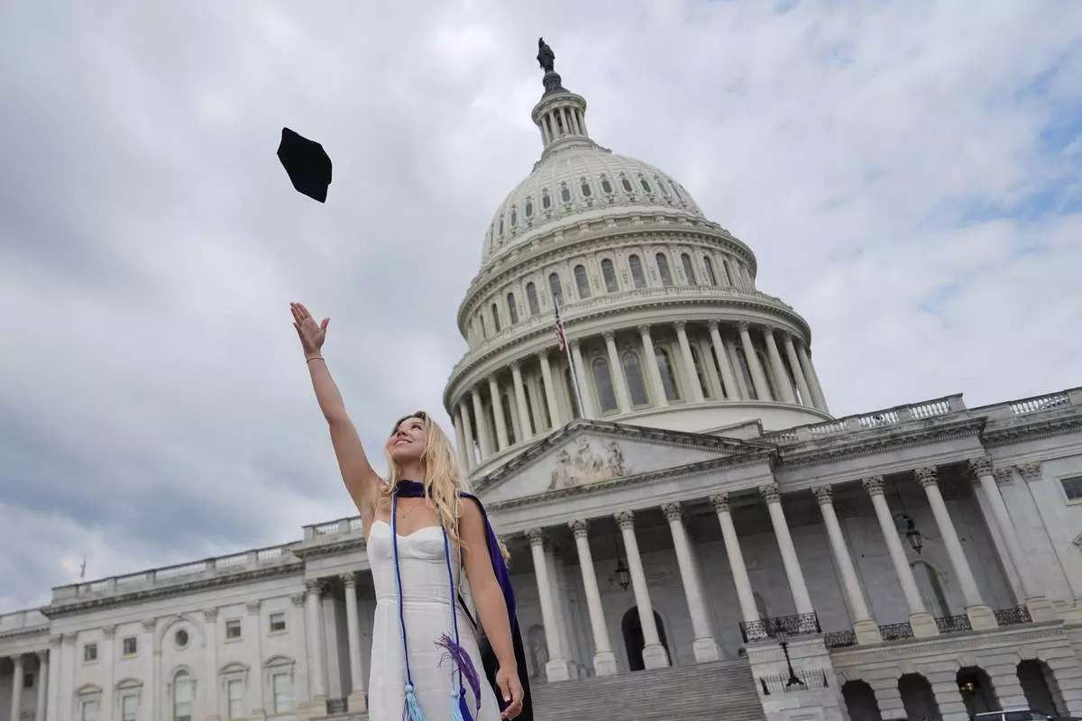 Georgetown Law student Sydnie Leigh throws her cap in the air while taking graduation photos in front of the U.S. Capitol, Thursday, May 8, 2025, in Washington. (AP Photo/Julia Demaree Nikhinson)