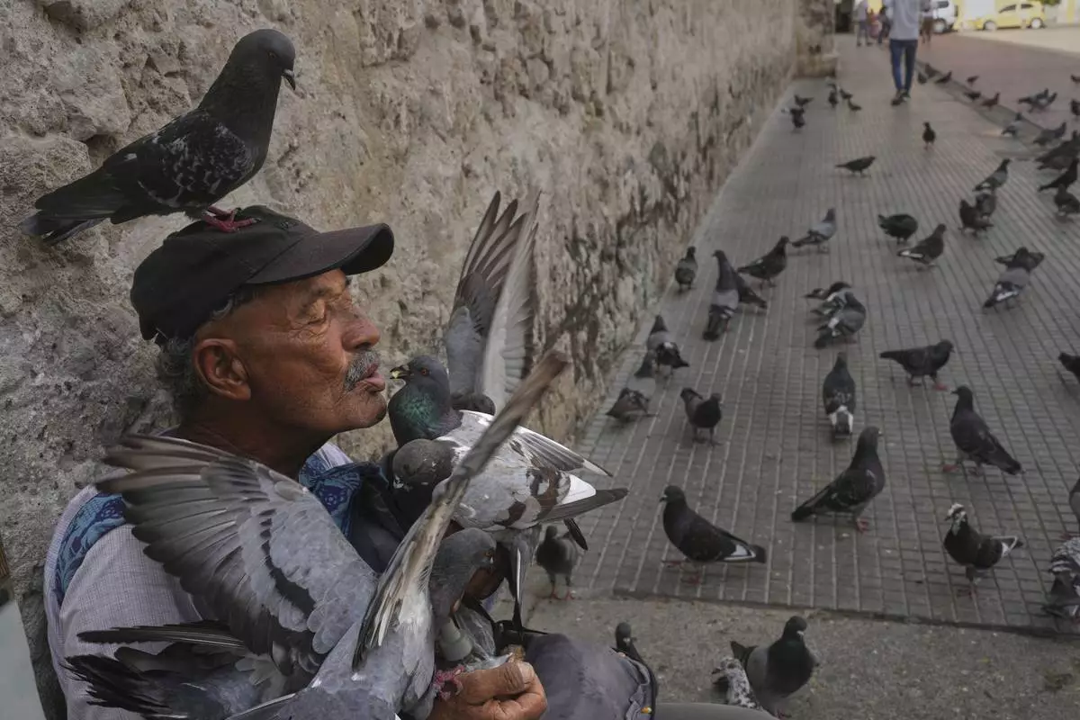 Jean Paul Correa Vasco feeds pigeons outside the Cathedral in Cartagena, Colombia, Thursday, May 8, 2025. (AP Photo/Rodrigo Abd)