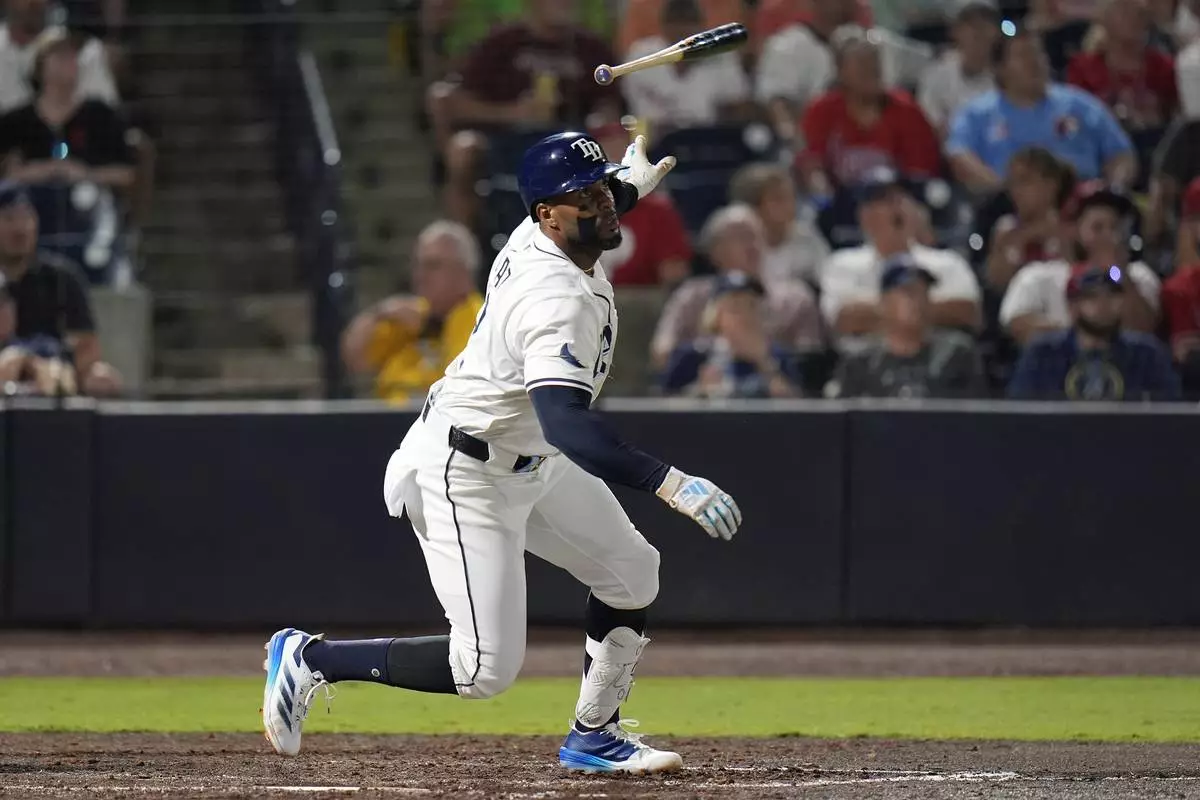 Tampa Bay Rays' Yandy Díaz flips his bat after hitting a three-run home run off Philadelphia Phillies pitcher Tanner Banks during the seventh inning of a baseball game Thursday, May 8, 2025, in Tampa, Fla. (AP Photo/Chris O'Meara)