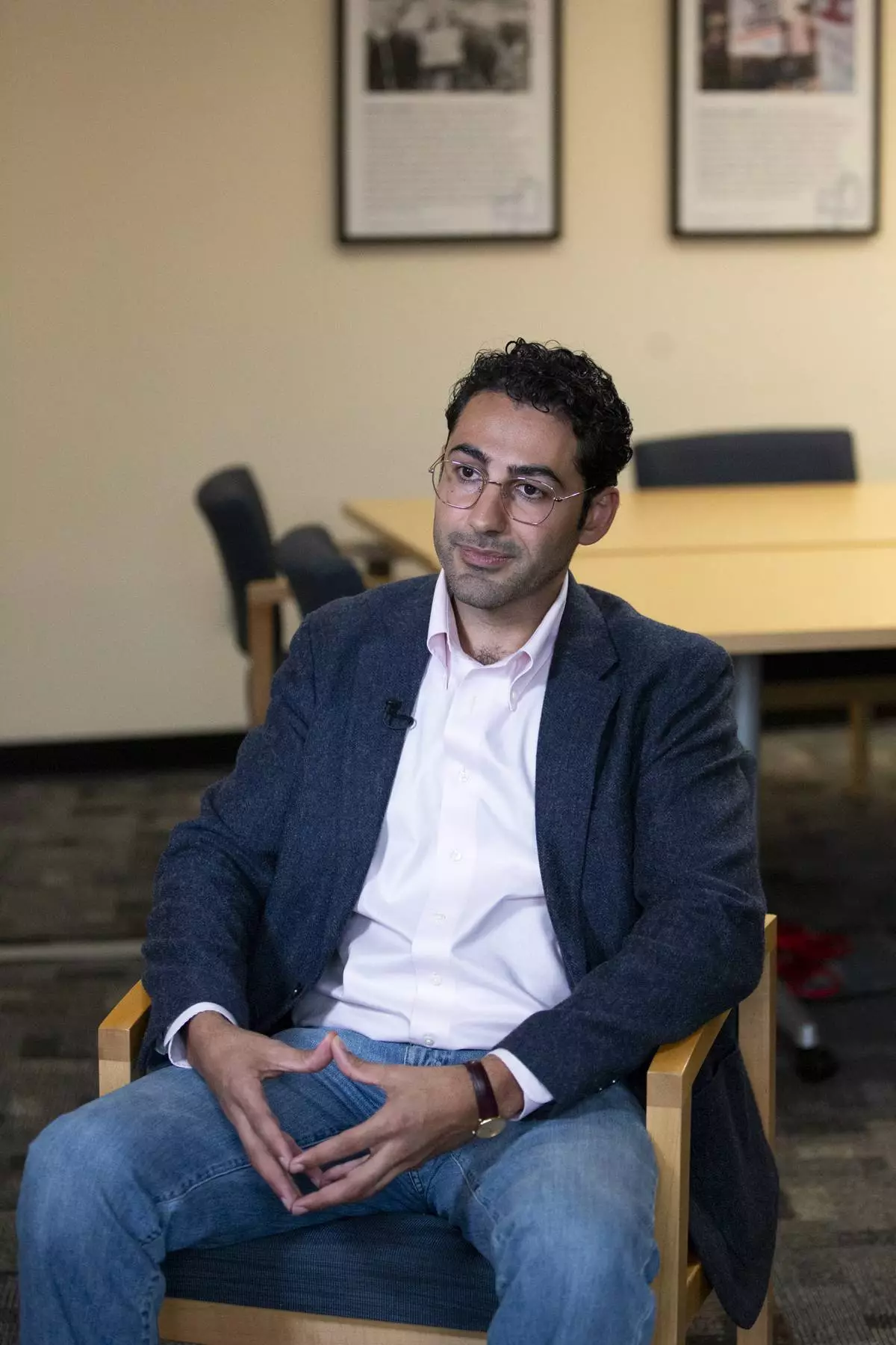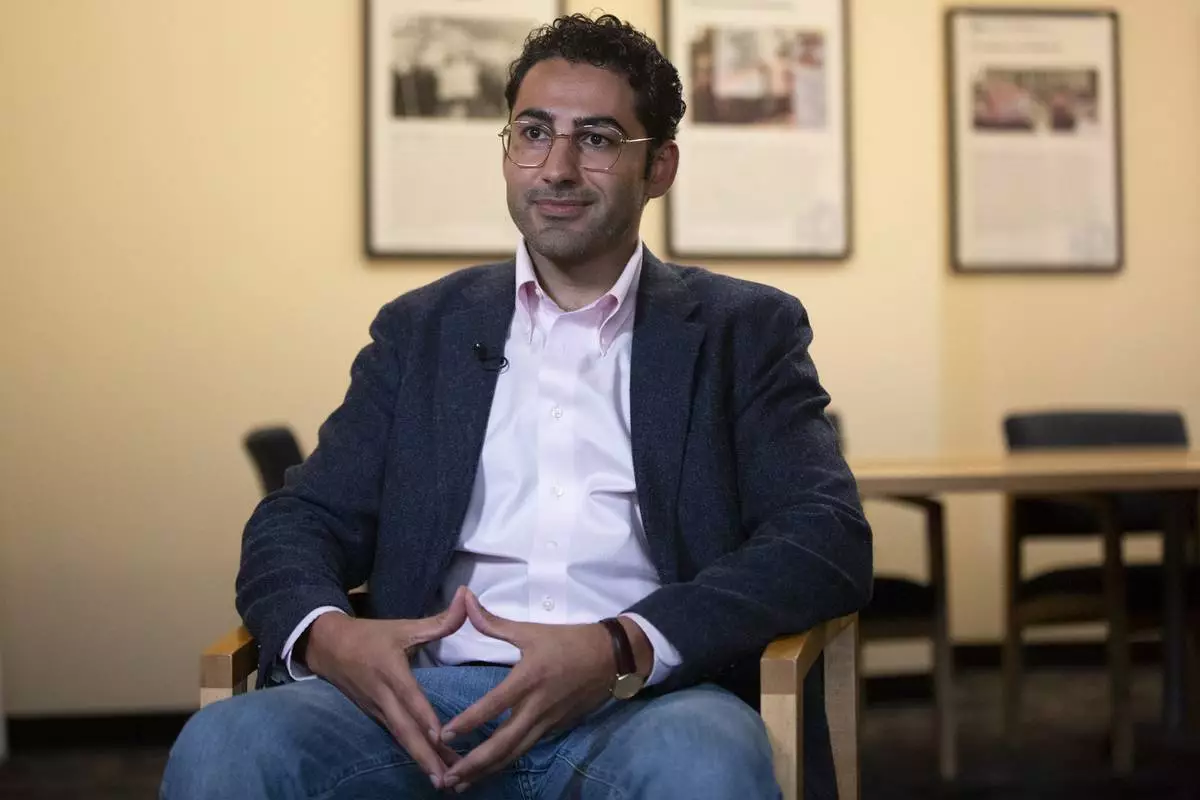 Mohsen Mahdawi speaks during an interview at the ACLU of Vermont on Thursday, May 8, 2025, in Montpelier, Vt. (AP Photo/Alex Driehaus)