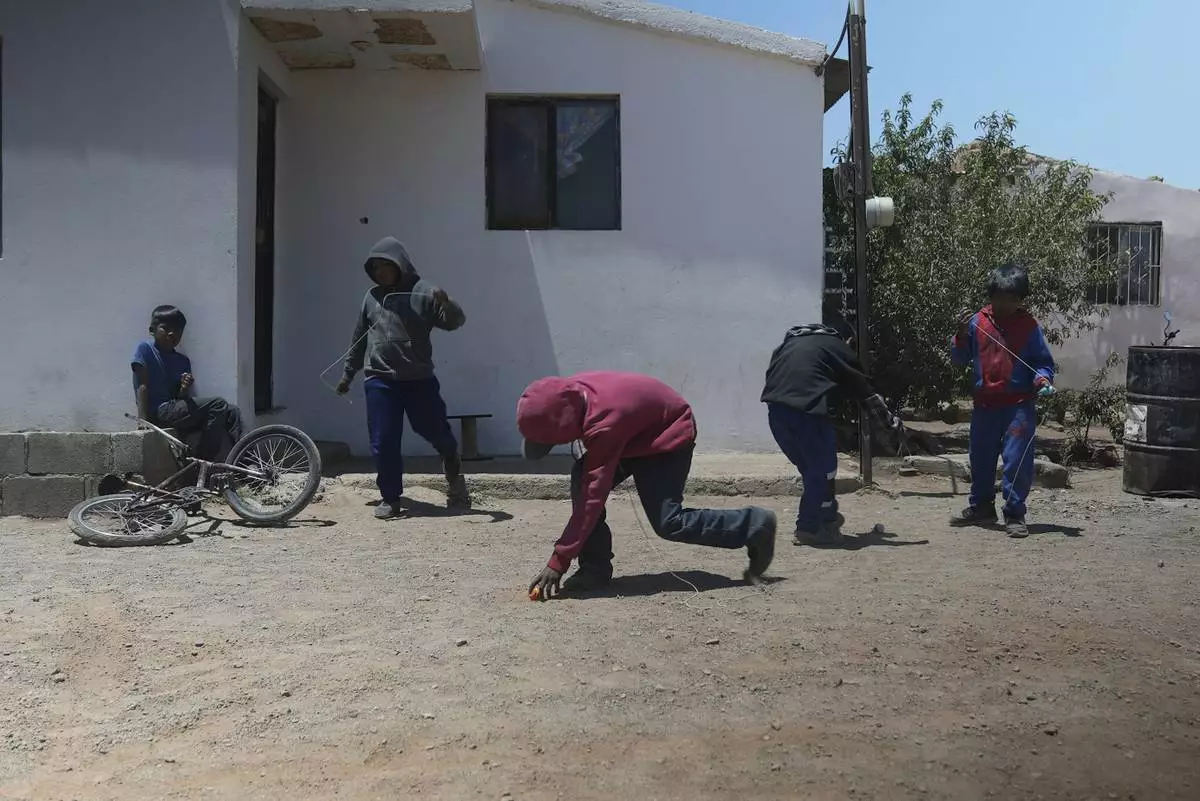Tarahumara Indigenous children play outside their homes in Cuauhtemoc, Mexico, Thursday, May 1, 2025. (AP Photo/Martin Silva Rey)
