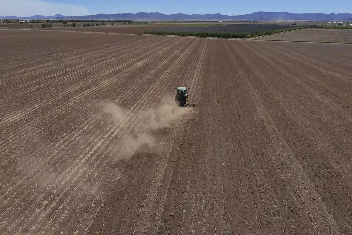 A tractor works a field belonging to members of the Mennonite community in Cuauhtemoc, Mexico, Thursday, May 1, 2025. (AP Photo/Martin Silva Rey)