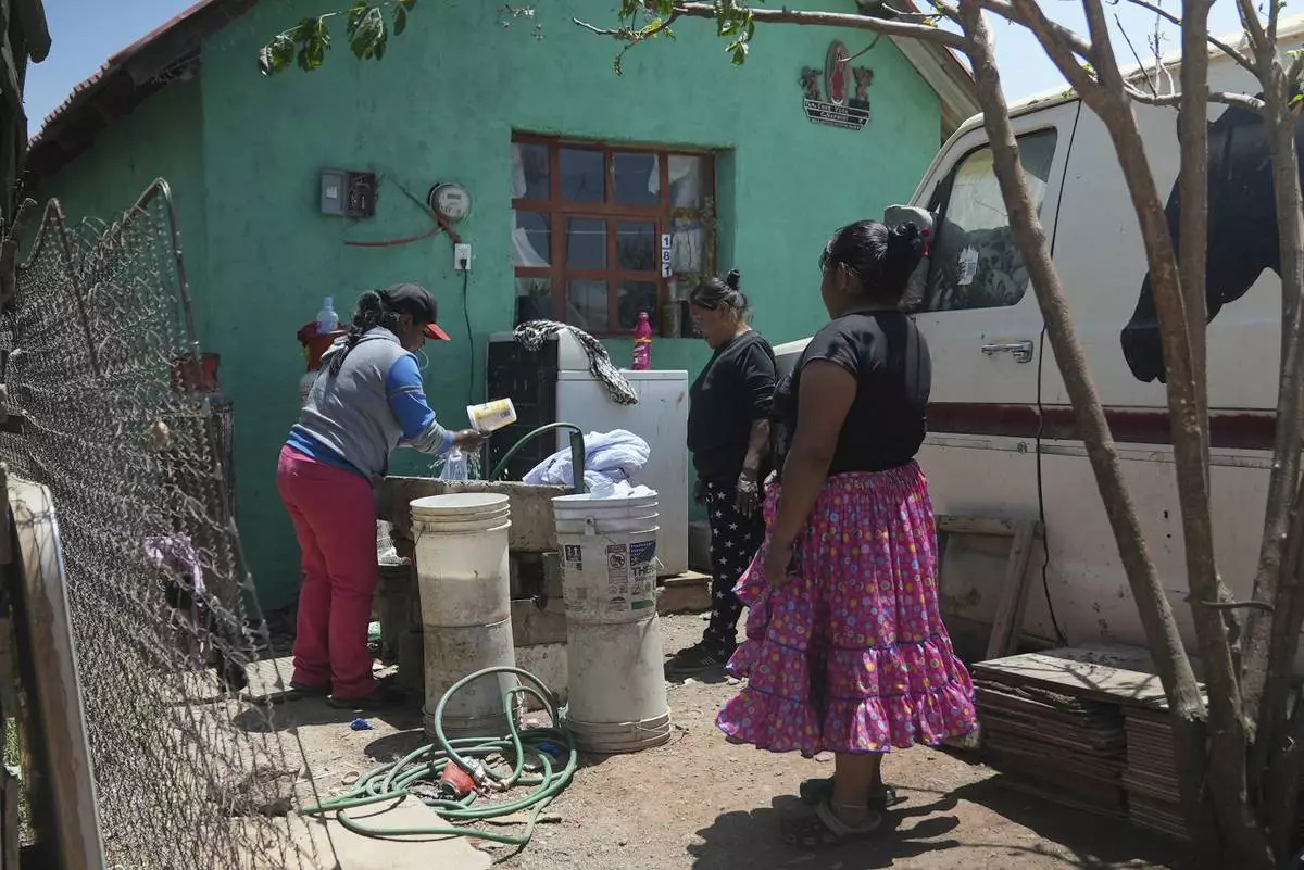 Tarahumara Indigenous woman Gloria Vega, right, watches a neighbor wash clothes outside her home in Cuauhtemoc, Mexico, Thursday, May 1, 2025. (AP Photo/Martin Silva Rey)