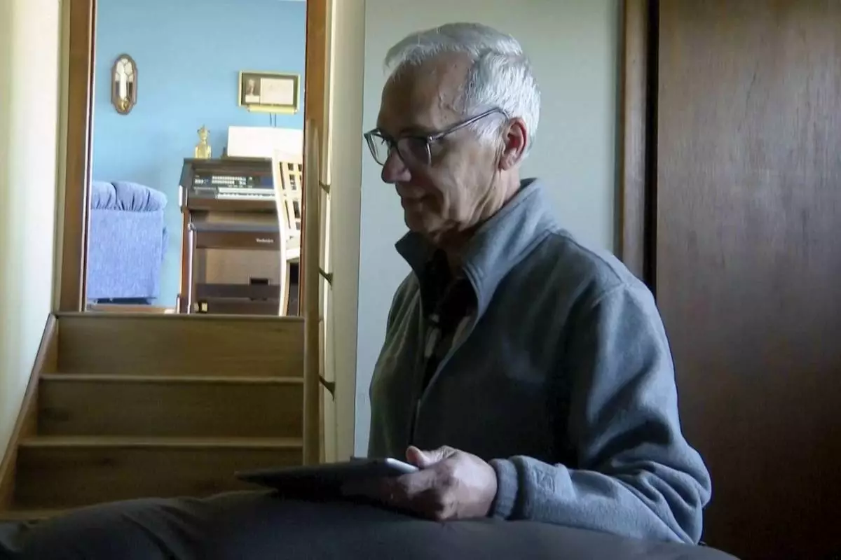 John Prevost speaks to his brother Robert Prevost, who was newly elected as Pope Leo XIV, during a call on Thursday, May 8, 2025, in New Lennox, Ill. (AP Photo/Obed Lamy)