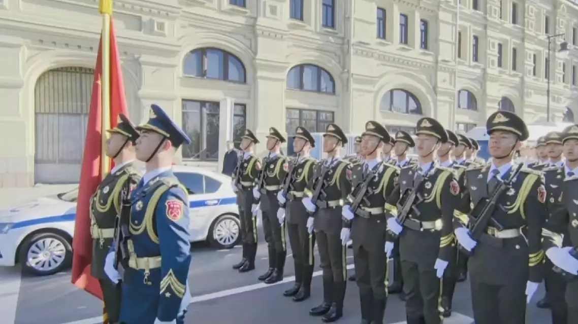 A unit of the Guard of Honor of the People's Liberation Army of China is preparing to make a striking appearance at a massive military parade in Moscow's Red Square on Friday morning.