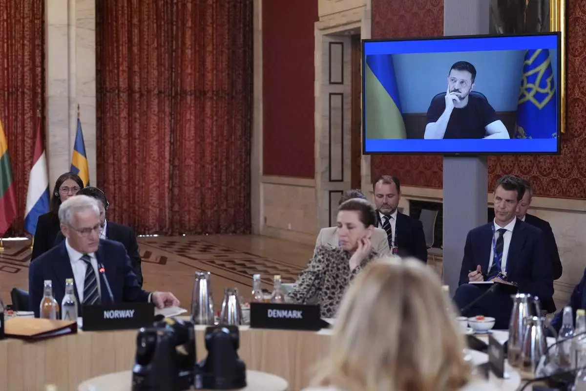 Ukrainian President of Ukraine Volodymyr Zelenskyy listens to Norway's Prime Minister Jonas Gahr Støre, as he joins Europe leaders via video link, during a meeting of the Joint Expeditionary Force (JEF) in Oslo, Friday, May 9, 2025. (Lise Åserud/NTB Scanpix via AP)