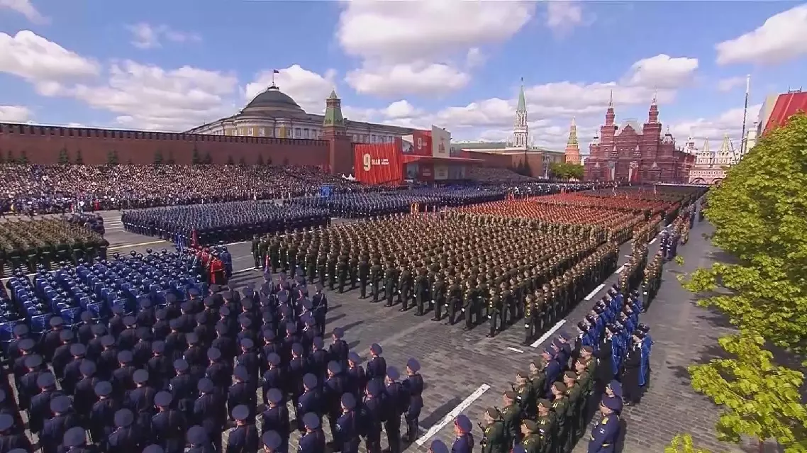 Following the speech, the military band played the Russian national anthem, salutes were fired across Red Square, and the grand military parade began. Marching in formations, the parade units passed through the square one after another.
