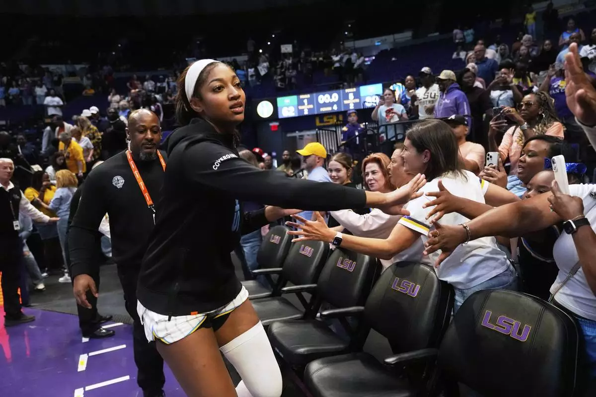 Chicago Sky forward Angel Reese greets the crowd after a WNBA exhibition basketball game against Brazil in Baton Rouge, La., Friday, May 2, 2025. (AP Photo/Gerald Herbert)