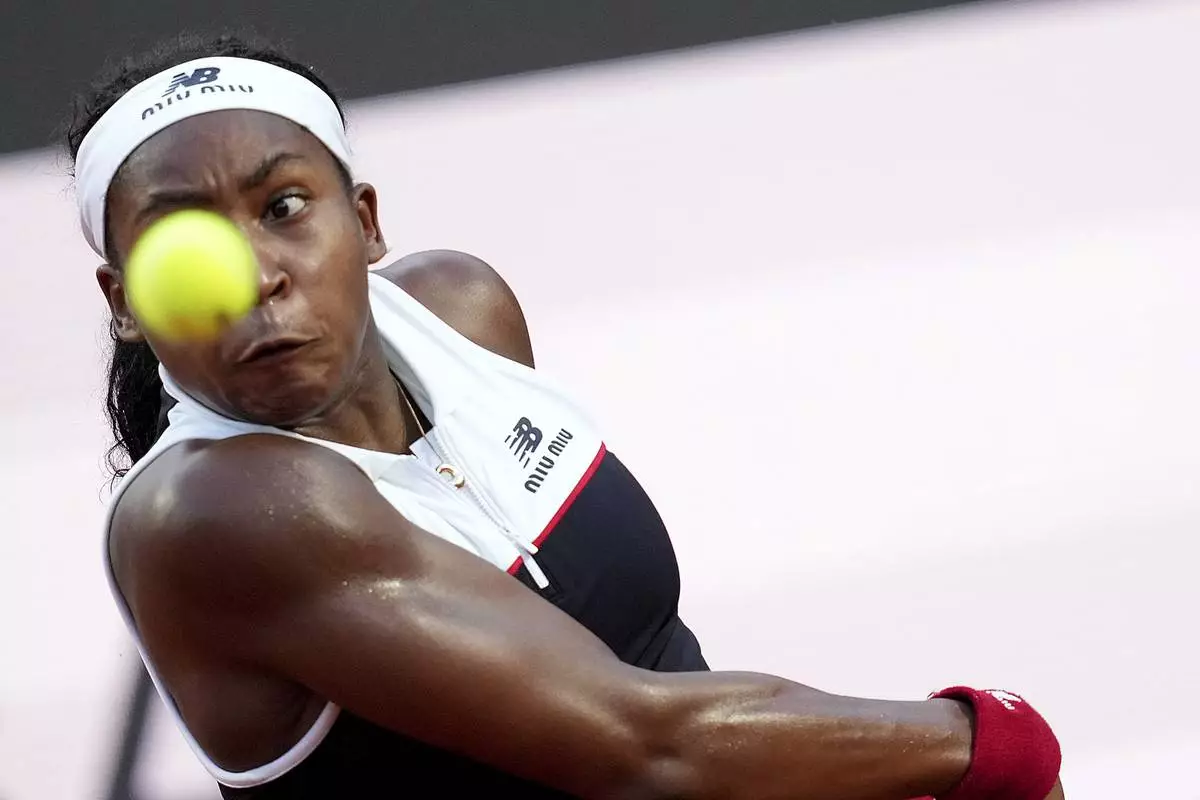Coco Gauff of the US returns to Canada's Victoria Mboko during the Italian Open tennis tournament in Rome, Friday May 9, 2025. (Alfredo Falcone/LaPresse via AP)